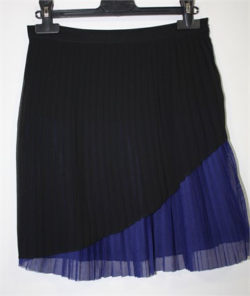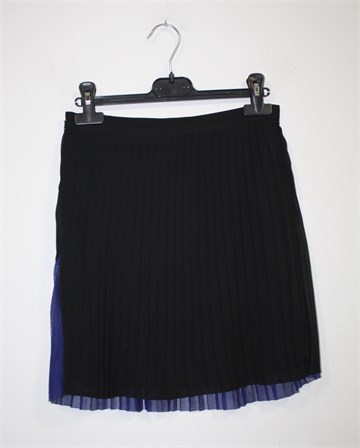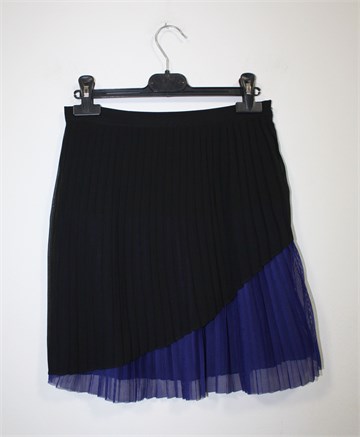 Naf Naf plisirana suknja crne boje, sa prednje strane dio suknje je kraći i proviruje plavi materijal (mrežasti plisirani til). Bočni cif, podstavljena. Nešto je duža sa prednje strane (vidjeti mjere).