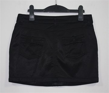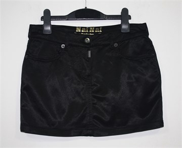 Naf Naf kratka suknja od satena, crne boje. Prednji cif i kopčanje, pasica za remen. Prednji i stražnji džepovi. Blago rastezljiva i blago sjajna.