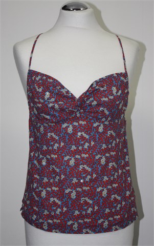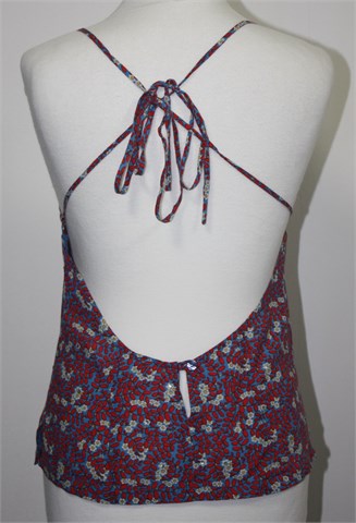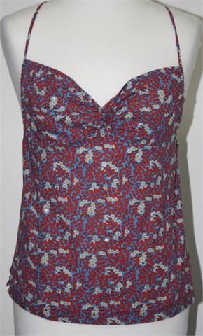 Naf Naf topić plave boje sa šarenim cvjetnim printom i aplikacijama (mjestimično su našivene male okrugle šljokice). Križno vezanje na leđima, leđa su otvorena. Mali bočni prorezi. Lagan i prozračan.