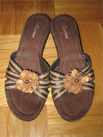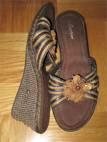 Natikače na punu petu (peta ima pleteni uzorak tamno smeđe boje sa našivenim aplikacijama). Boje koje prevladavaju su tamno i svijetlo smeđa, malo bež i tamno zelene.