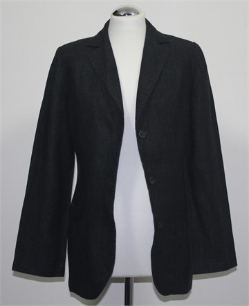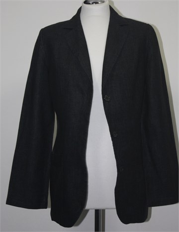 Nebo sako/blazer od lana, prošarano tamno sive boje. Prednje skriveno kopčanje sa tri gumba, dva prednja džepića. Blago strukiran, sa malim jastučićima na ramenima. Podstavljen.