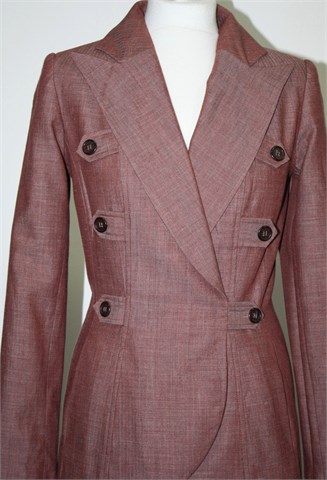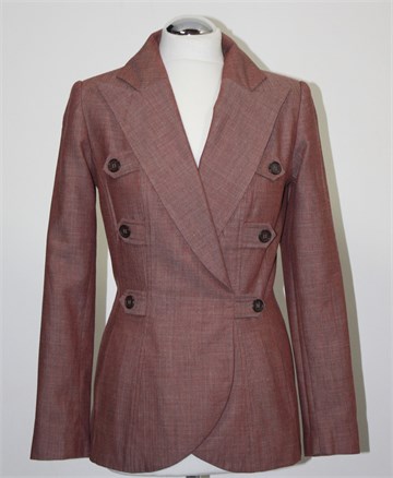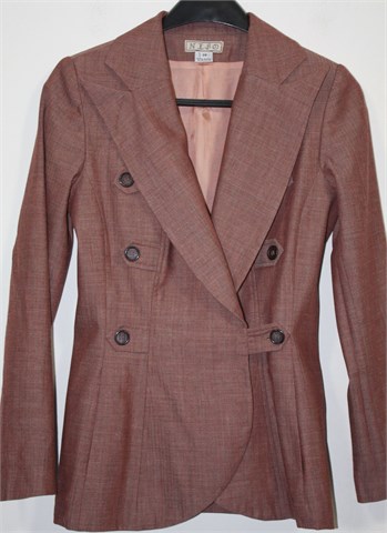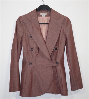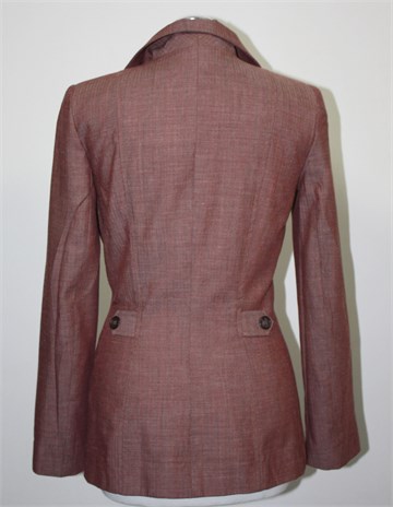 Nebo sako/blazer prošarane boje (nedefinirana prljavo rozo-narančasto-siva boja sa uzorkom na materijalu), prednje kopčanje. Blagi jastučići u ramenima, podstavljen. Blago sjajan materijal, nije rastezljiv.