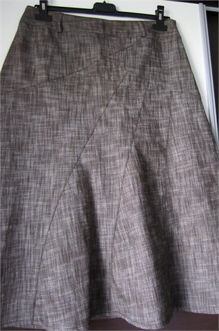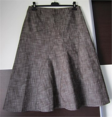 New Directions suknja midi dužine, prošarano smeđe boje. Suknja ima pasicu za remen i bočni cif. Ukrasni proštepi sa prednje i stražnje strane. Materijal je rastezljiv i lijepo se prilagođava tijelu, u gornjem dijelu suknja je uža a prema dnu se blago širi. Super materijal, nosiva je cijelu godinu :)