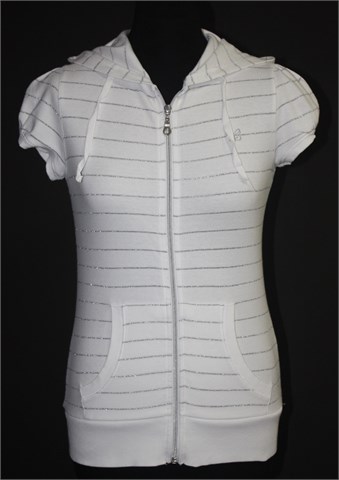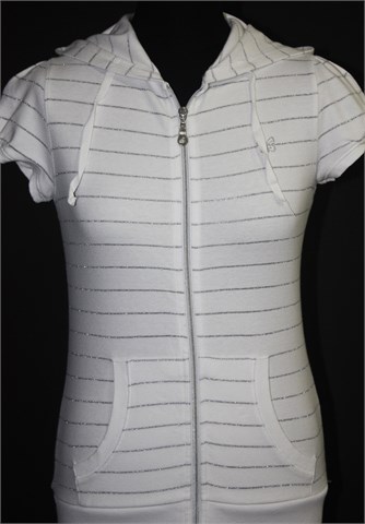 New Look majica sa kratkim rukavima, ima kapuljaču i cif. Bijele boje sa srebrnim (blago šljokastim) prugicama. Prednji cif, špagice u kapuljači. Blago rastezljiva.