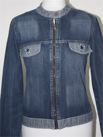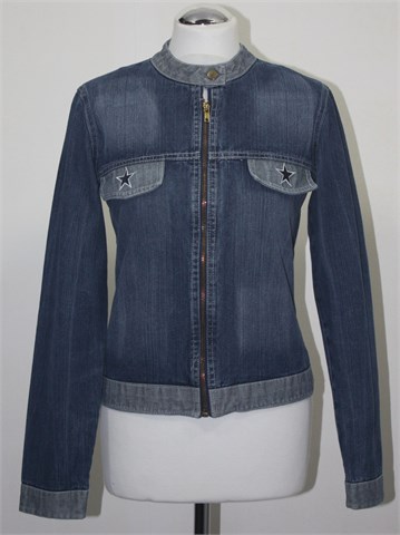 New Max jakna od trapera, srednje plave boje. Prednje kopčanje na cif, ukrasni džepovi sa našivenim aplikacijama (mrvicno oštećenje na šavu kod džepa ali nije jako primjetno). Mjestimično ispranog izgleda (tvornički).