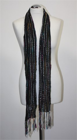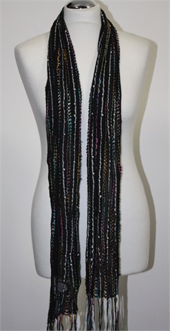New York & Company šal sa resama na krajevima, crne boje sa upletenim šarenim nitima. Tanji, mekan i lagan (može se nositi kao šal ili marama).