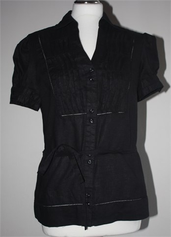 Next košulja od lana sa kratkim rukavima, crne boje. Prednje kopčanje, ukrasni prošivi na prsima, vezanje u struku. Blagi puf rukavi sa gumbima. Deblji i čvrsti lan.