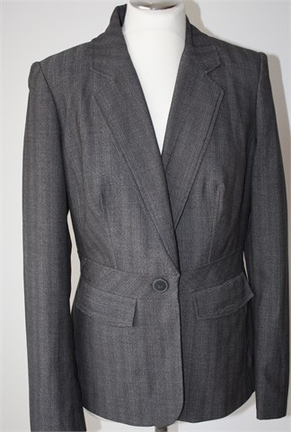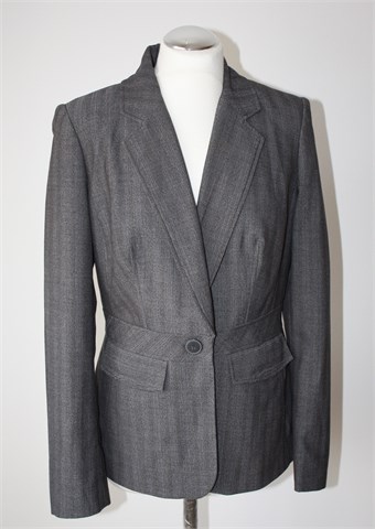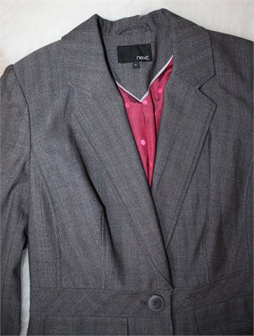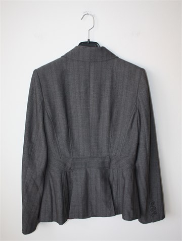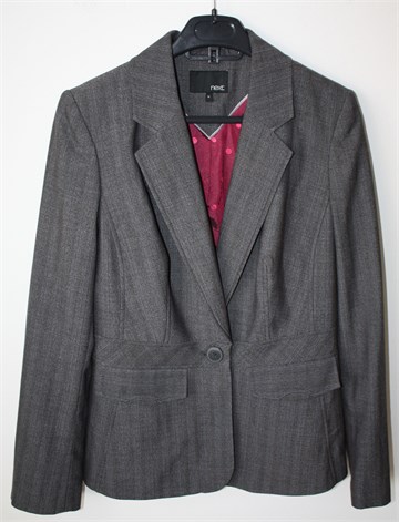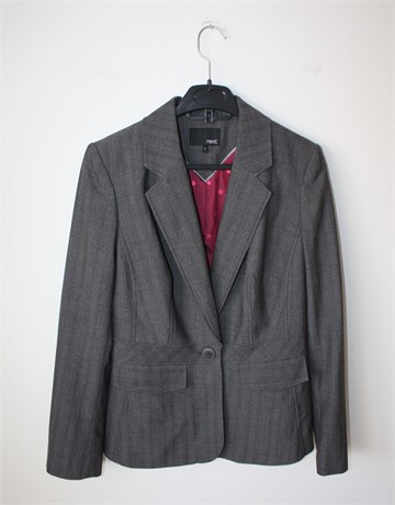 Next sako/blazer sive boje sa uzorkom na materijalu (vidljivo na slikama). Prednje kopčanje, bočni džepovi sa preklopom. Jastučići u ramenima, podstavljen.