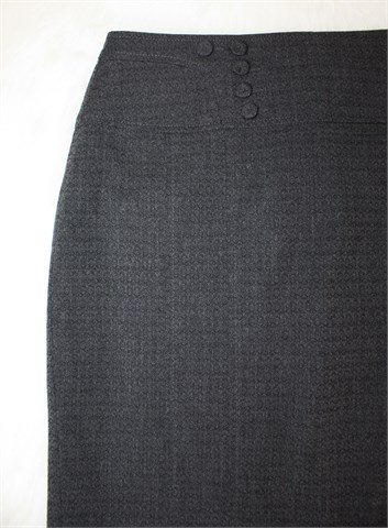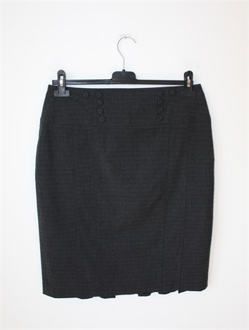 Next suknja sive boje sa uzorkom na materijalu (vidljivo na slikama). ukrasni gumbići sa prednje strane, sa stražnje strane u donjem dijelu falde. Stražnji cif i gumbić, podstavljena. Blago rastezljiva.