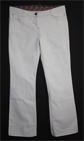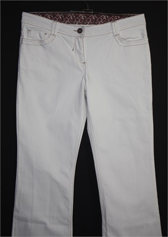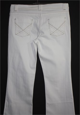 Next traper hlače bijele boje (nisu skroz bijele), preštepane svijetlo smeđim koncem. Prednji i stražnji klasični džepovi (stražnji ukrašeni proštepima od konca), pasica za remen i prednje kopčanje na cif i gumbić. Materijal je čvrst, blago rastezljiv.