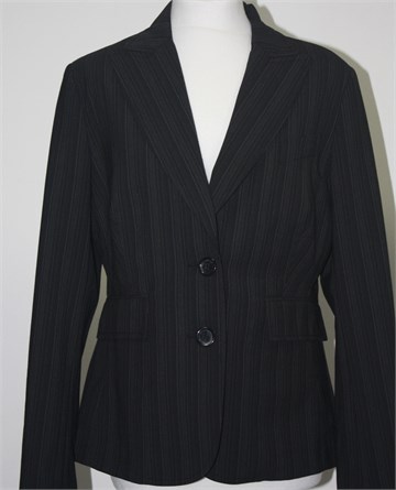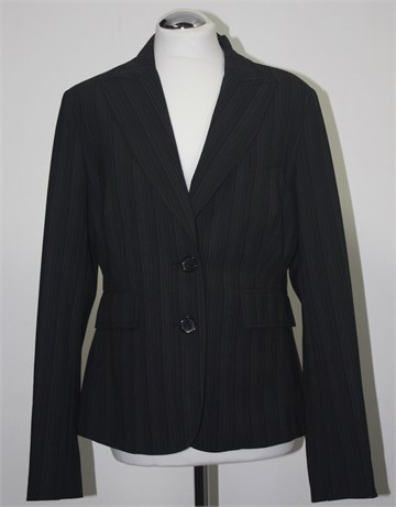 Niama Woman sako crne boje sa širim i tanjim prugama u sivoj boji. Prednje kopčanje sa dva gumba, dva bočna džepića. Na krajevima rukava gumbići (po 3 gumba sa svake strane). Podstavljen, podstava je obrubljena lijepim smeđim čipkastim materijalom. Mali rasporak sa stražnje strane po sredini, blagi jastučići u ramenima.