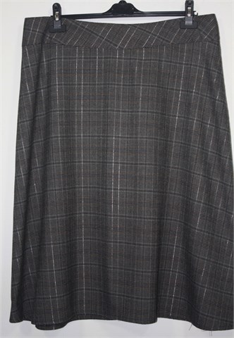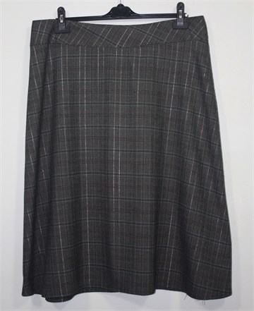 Nice Wear suknja od tanjeg i mekanog štofastog materijala, sive boje sa prugasto-kariranim uzorkom (mjestimično protkana sjajnim nitima). Stražnji cif, blago rastezljiva.