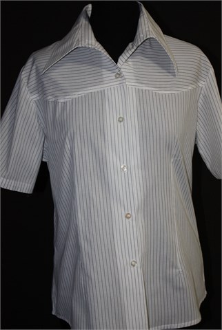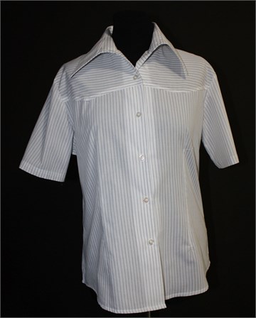 Nin košulja sa kratkim rukavima, bijele boje sa crnim prugama. Prednje kopčanje, blago strukirana. Lagan i nerastezljiv materijal.
