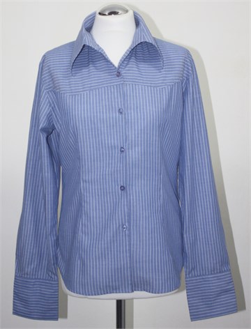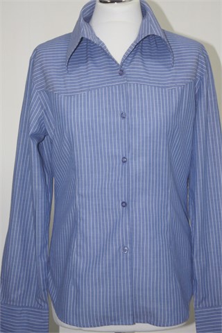 Nin košulja sa dugim rukavima, plave boje sa bijelim prugama. Prednje klasično kopčanje, strukirana. Lagan materijal, nije rastezljiv.