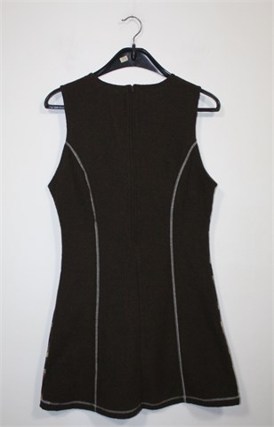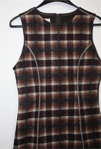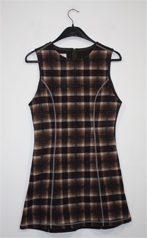 Nina D'Or (J.I.F.) zimska hajina/tunika bez rukava, smeđe boje sa prugasto kariranim uzorkom sa prednje strane (sa stražnje strane je smeđa). Ukrasni prošivi sa prednje i stražnje strane, strukirana. Mekan, mucast i topli materijal. Cif sa stražnje strane.
