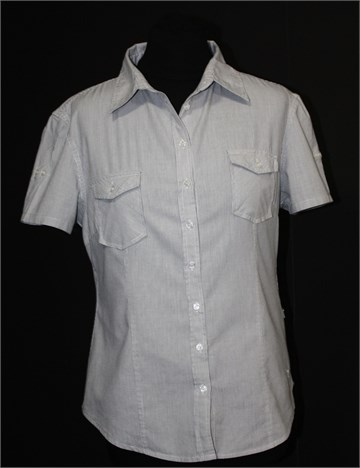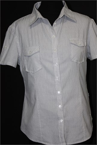 NoName košulja sa kratkim rukavima, bijele boje sa crnim prugama. Prednje kopčanje, džepići na prsima. Blago strukirana, nije rastezljiva.