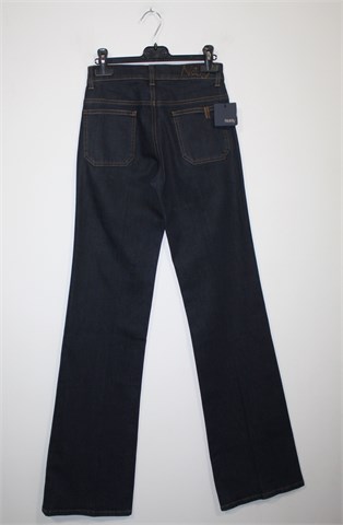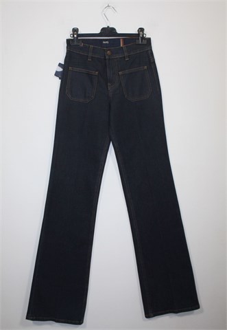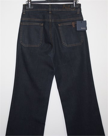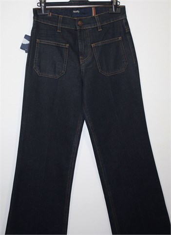 Notify traper hlače tamno plave boje sa blagim navoskanim slojem. Prednji cif i kopčanje, pasica za remen. Prednji i stražnji džepovi, šire nogavice. Blago rastezljive.