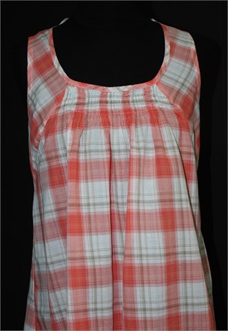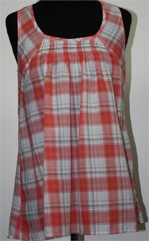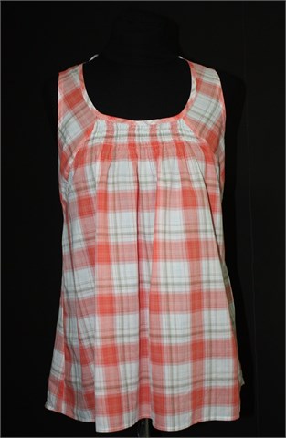 Number One bluza bez rukava, prugasto-karirani uzorak u kombinaciji bijele, crveno-narančaste i sive boje (kao na slici). Tanak, lagan i prozračan pamuk.