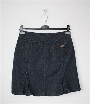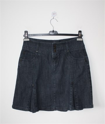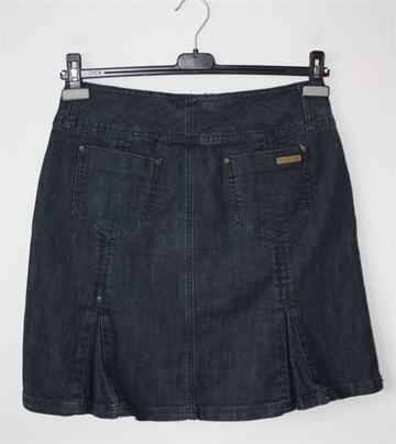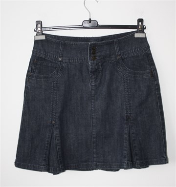 Number One traper suknja plave boje, falde sa prednje i stražnje strane. Prednji cif i kopčanje, pasica za remen. Prednji i stražnji džepovi, blago rastezljiva. Malo duža sa stražnje strane (vidjeti mjere).