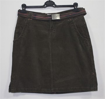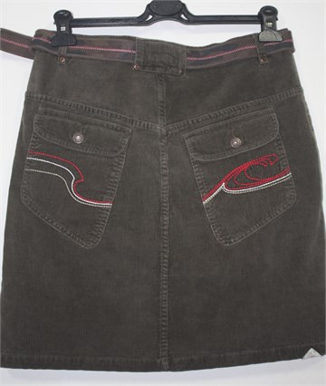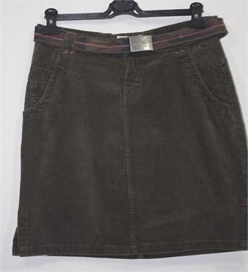 O'Neill suknja od samta, maslinasto-smeđe boje. Prednji cif i kopčanje, pasica za remen (sa pripadajućim remenom koji se može skinuti). Prednji i stražnji džepovi.
