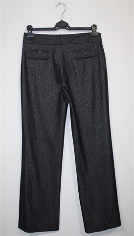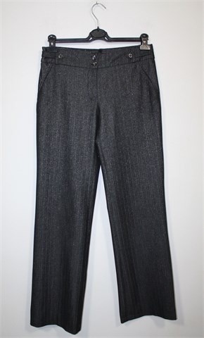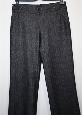 OK & Teks hlače crne boje sa srebrnim nitima i uzorkom (blago šljokave) - djeluju tamno sivo. Prednji cif i kopčanje, pasica za remen. Prednji i stražnji ukrasni džepovi. Mekan i lagan materijal, vrlo blago rastezljiv.