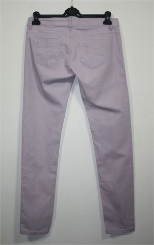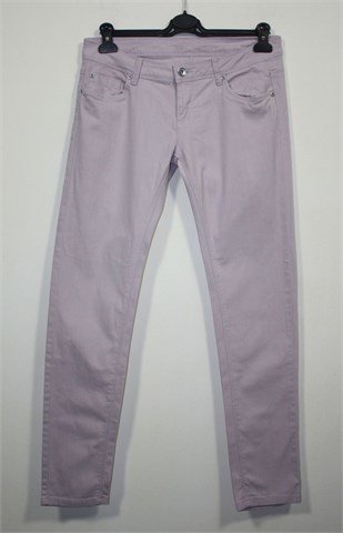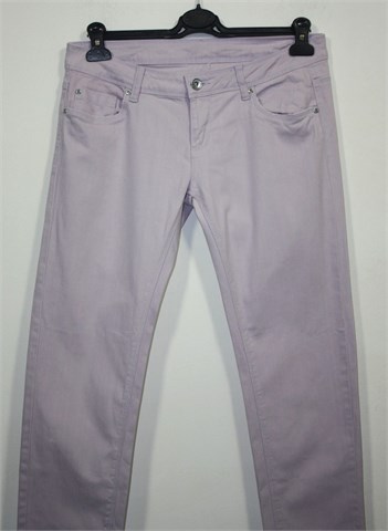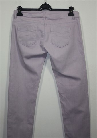 OVS (Oviesse) traper hlače svijetlo lila boje/boje lavande/svijetlo ljubičaste boje. Prednji cif i kopčanje, pasica za remen. Prednji i stražnji klasični džepovi, blago rastezljive. Mjestimično iscufanog izgleda (oko rubova džepova - tvornički). Ravne i uske nogavice.
