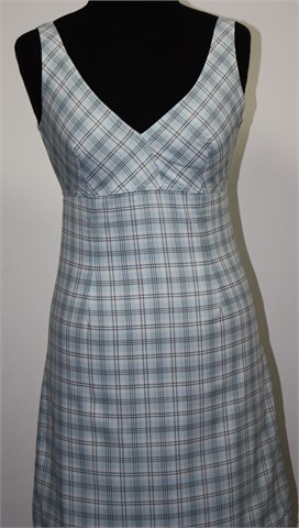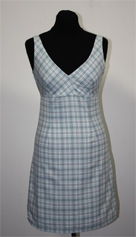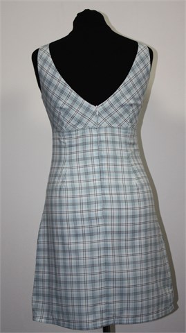 Oasis haljina bez rukava, plavo-bijele boje sa crnim prugastim uzorkom (kao na slici). Rezana ispod prsiju, strukirana (odlično prati liniju tijela). Stražnji cif, pamučna podstava. Čvrst materijal, nije rastezljiv.