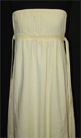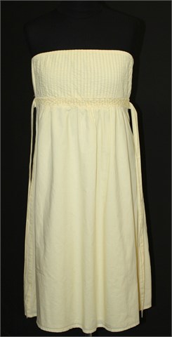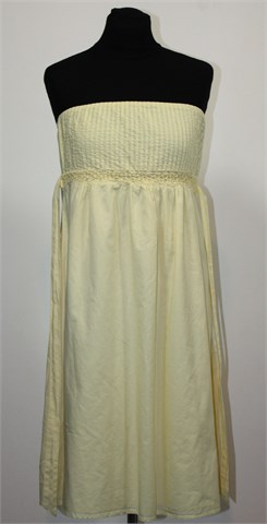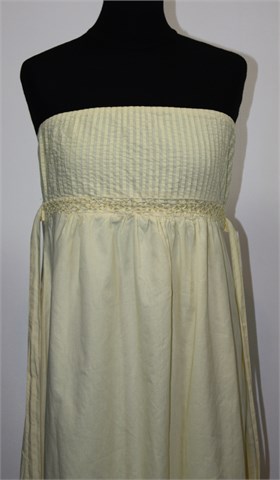 Oasis pamučna haljina svijetlo žute boje. Sa stražnje strane (na leđima) je prošivena sa rastezljivim gumicama pa je širina prilagodljiva (vidjeti mjere).  Može se nositi sa ili bez naramenica (naramenice ne dolaze uz haljinu). Sa prednje strane (na prsima) ukrasni prošivi, ispod našivene perlice. Bočne trake za vezanje, bočni cif. Podstavljena pamučnom podstavom.