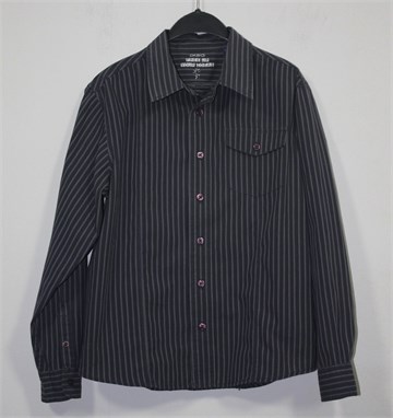 Okaidi košulja sa dugim rukavima, tamno sive boje sa prugama. Prednje klasično kopčanje, džepić na prsima. Čvrst i kvalitetan pamuk.