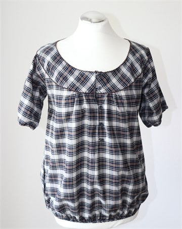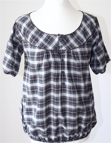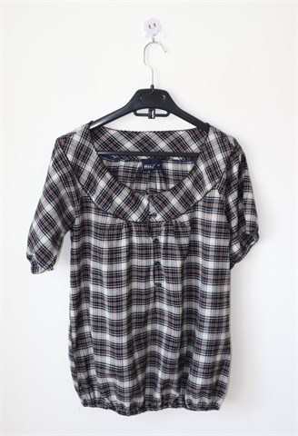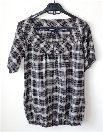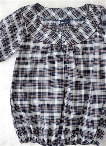 Okay bluza sa kratkim rukavima, karirani uzorak (boje i uzorak vidljivi na slikama). Prednji gumbići, na kraju svakog rukava i na dnu pasice je ušivena gumica. Čvrst i nerastezljiv materijal.