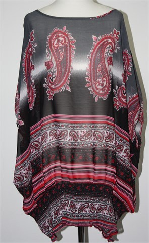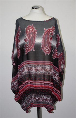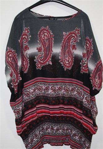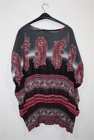 Okay bluza/tunika sa kratkim rukavićima, sivo-crne boje sa šarenim printom na materijalu (boje i uzorci kao na slikama). Gumica oko otvora rukava, stegnuta gumicama na dnu pasice (na par mjesta gumice su se malo odšile ali nije primjetno i ne smeta kod nošenja). Lagana i providna.