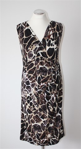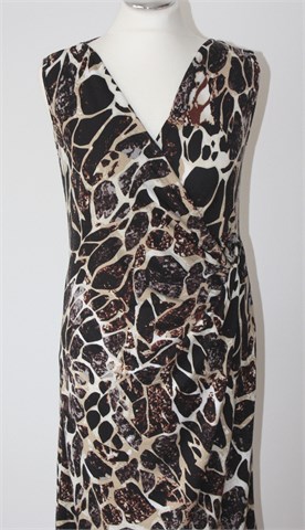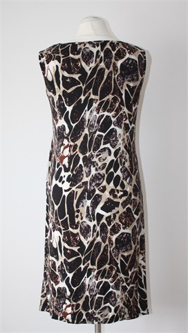 Okay haljina bez rukava, šarena kombinacija crne, smeđe, bež, bijele i sive boje (uzorak vidljiv na slikama). Sa prednje strane fiksni preklop (u gornjem dijelu). Tanak i lagan materijal, rastezljiv.