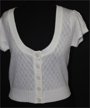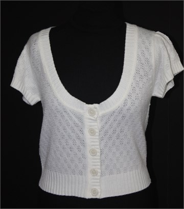 Okay kraća pletena vesta na kopčanje/kardigan sa kratkim rukavima. Mekano, lagano i šupljikavo pletivo. Rastezljiva.