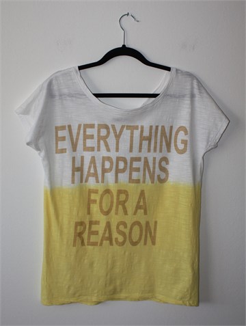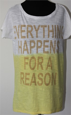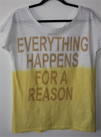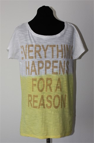 Okay majica/tunika sa kratkim rukavima, kombinacija bijele i žute boje sa prednjim printom (vidljivo na slikama). Blago rastezljiva.