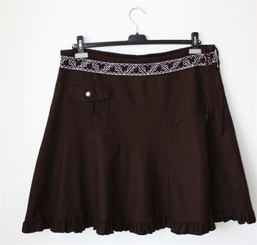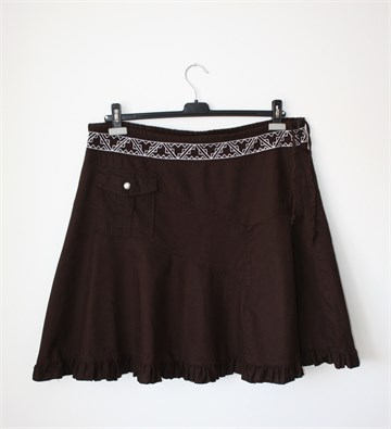 Okay suknja tamno smeđe boje, pasica ukrašena aplikacijom od bijelog konca. Bočni cif i vezice, prednji džepić sa preklopom i gumbom. Na dnu suknje volančić, sa stražnje strane prorez obrubljen volančićem. Čvrsta i nerastezljiva.