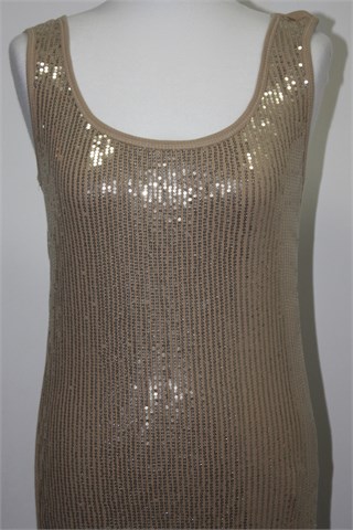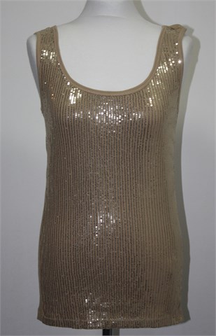 Okay topić/majica bez rukava bež boje, sa prednje strane zlatne šljokice, sa stražnje strane klasičan rebrasti t-shirt materijal. Vrlo mekan i rastezljiv.