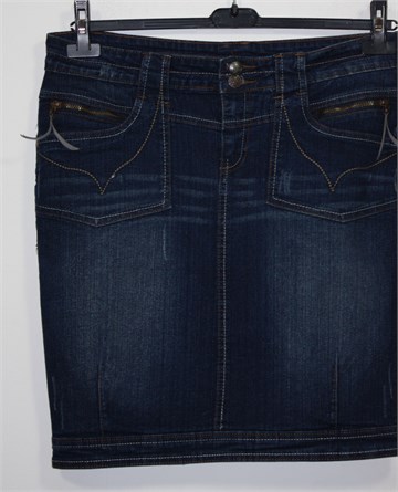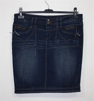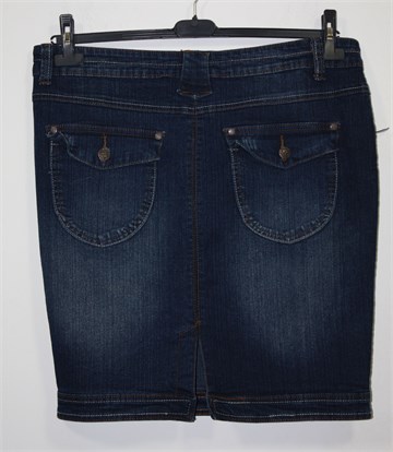 Okay suknja od trapera, tamnije plave boje mjestimično ispranog i iscufanog izgleda (tvornički used look). Prednji cif i kopčanje, pasica za remen. Prednji i stražnji džepovi, mali rasporak sa stražnje strane. Rastezljiva.