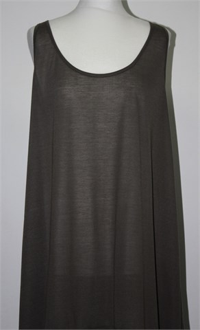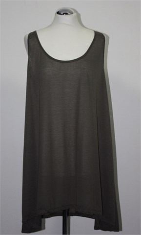 Okay tunika bez rukava maslinasto-smeđe boje. Duža sa stražnje strane (vidjeti mjere). Tanji i blago providan materijal. Rastezljiva.