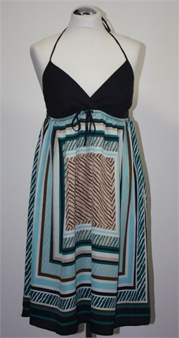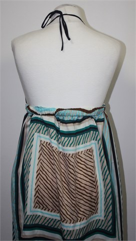 Old Navy haljina od blago sjajnog i na opip svilenkastog materijala. Gornji dio crne boje, donji dio sa printom (boje i uzorak printa kao na slikama). Ispod prsiju je uvedena trakica za vezanje, sa stražnje strane (uz gornji rub) je ušivena guma pa je širina prilagodljiva (vidjeti mjere). Tanka i lagana, dupli materijal na prsima.