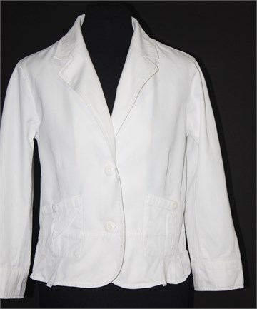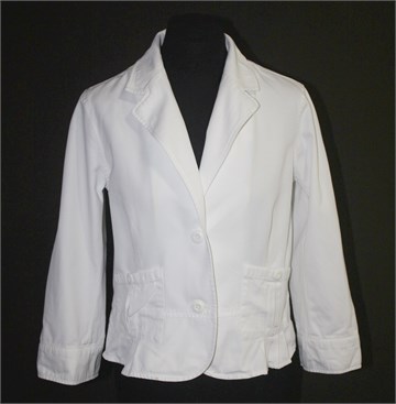 Old Navy kraća jakna/sako bijele boje. Prednje kopčanje, bočni džepovi. Poludugi rukavi, sa stražnje strane ukrasni prošivi i faldice pri dnu jaknice. Čvrst i kvalitetan pamuk.