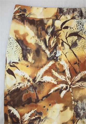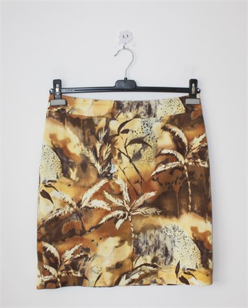 Olsen suknja sa šarenim printom (boje i uzorak printa vidljivi na slikama). Stražnji cif i gumbić (vezica gumbića se malo odcufala), mali stražnji rasporak.