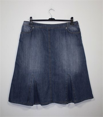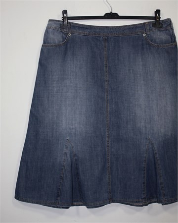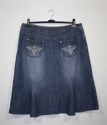 Olsen traper suknja, svijetlije plave boje mjestimično ispranog izgleda. Prednji bočni, stražnji klasični džepovi (ukrašeni aplikacijama od konca). Bočni cif, gumbić se odšio. Traper srednje debljine.