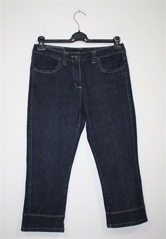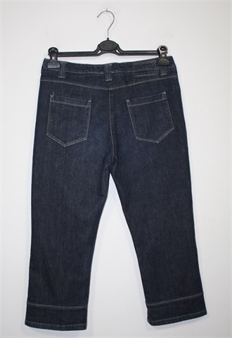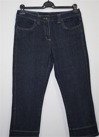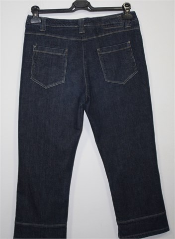 Oltre poluduge traper hlače, tamnije plave boje. Prednji cif i kopčanje, pasica za remen. Prednji i stražnji džepovi. Nogavice se mogu nositi podvinute ili otpuštene (kao na slici). Blago rastezljive, dublji model (vidjeti mjere).