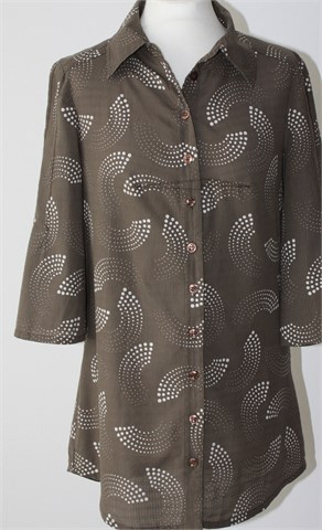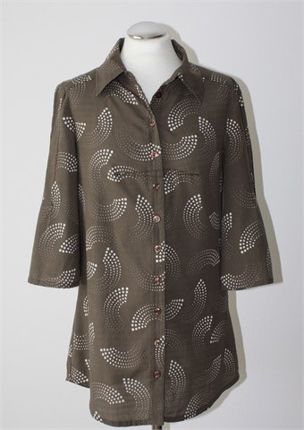 One Two duža košulja/tunika sa poludugim rukavima, maslinasto-smeđe boje sa bijelim printom i diskretnim prugastim uzorkom na materijalu. Prednje kopčanje, rukavići imaju ušitke i pri dnu se šire. Tanja i lagana, nije rastezljiva.