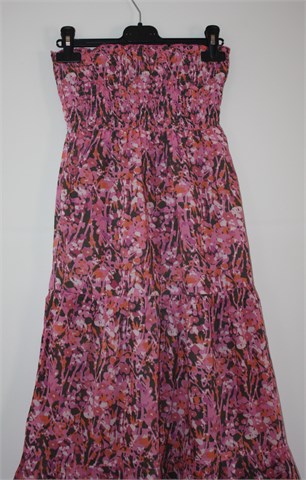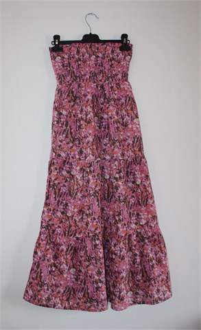 One by One dugačka/maxi haljina pretežno roze boje sa cvjetnim printom/uzorkom (kao na slici). U gornjem dijelu (sa obje strane) prošivena gumicama pa je širina vrlo prilagodljiva. Tanji i lagan pamuk (čvrst).