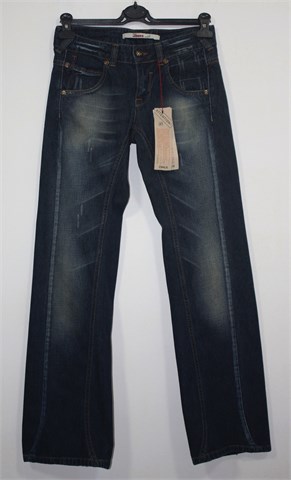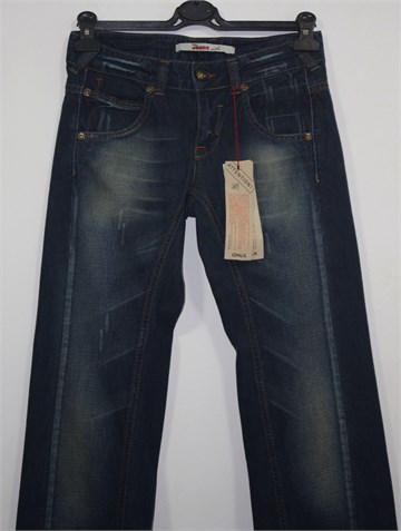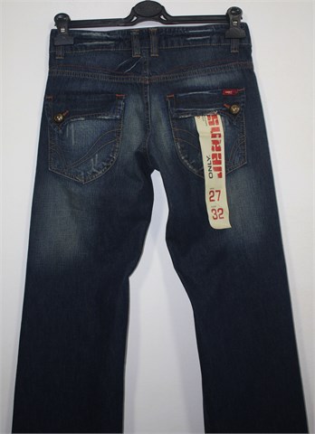 Only jeans traper hlače, tamniji traper mjestimično iscufanog i ispranog izgleda (tvornički). Prednji cif i kopčanje, pasica za remen. Prednji i stražnji džepovi.