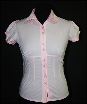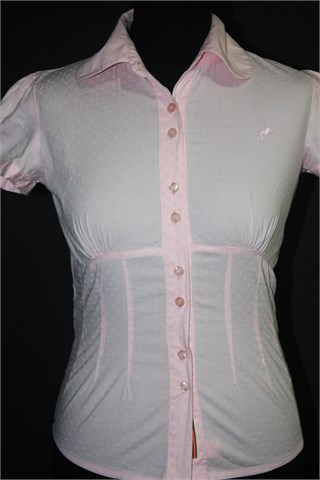 Only košulja sa kratkim rukavima, svijetlo roze boje sa sitnim rozim printom (na slici je ispala svijetlija nego uživo - cijela je jednake roze boje). Prednje klasično kopčanje, blagi puf rukavići sa gumbićem i malim otvorom. Prednji i stražnji ušitci (strukirana), prednji prošivi a sa stražnje strane remenčić. Mekan i rastezljiv materijal.