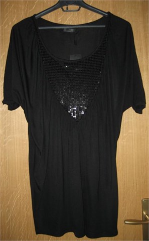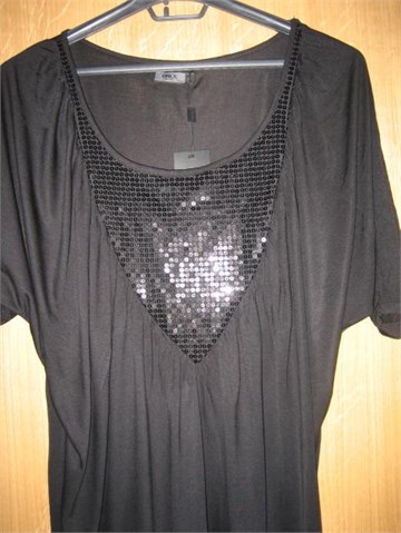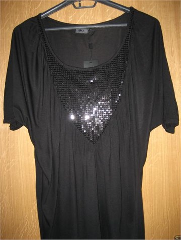 Prekrasna dugačka majica/tunika crne boje, sa prednje strane na dekolteu našivene crne šljokice. Gornji dio majice je širi i prema dnu se sužava. Oko dekoltea faldice, "šišmiš" kratki rukavi. Može se nositi i kao kratka haljina (vidjeti mjere).