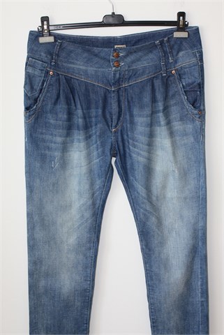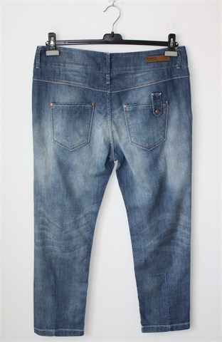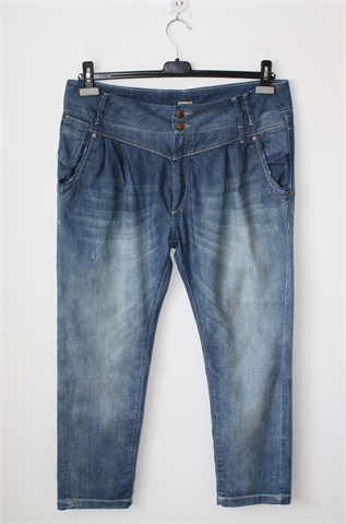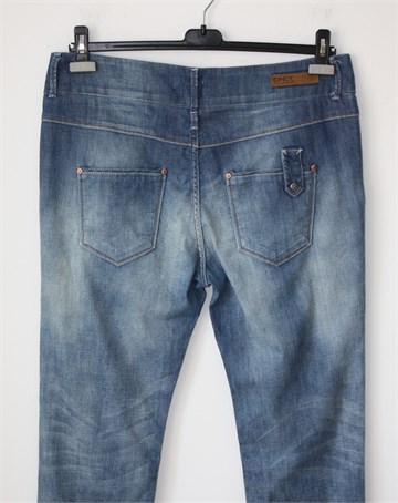 Only traper hlače plave boje sa mjestimično ispranim i blago poderanim izgledom (tvornički used look). Prednji cif i kopčanje, pasica za remen. Prednji bočni, stražnji klasični džepovi. Chino model (šire u gornjem dijelu, uže u nogavicama), vrlo blago rastezljive.