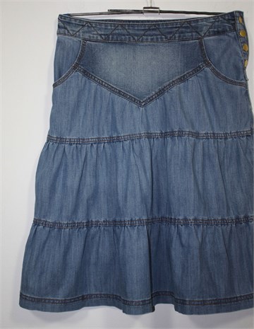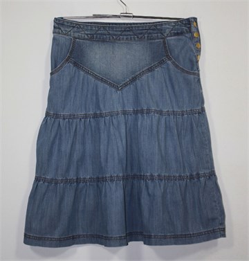 Only suknja od svijetlog trapera, sa volanima. Prednji bočni džepovi, u struku bočno kopčanje sa drukerima. Blago rastezljiva.